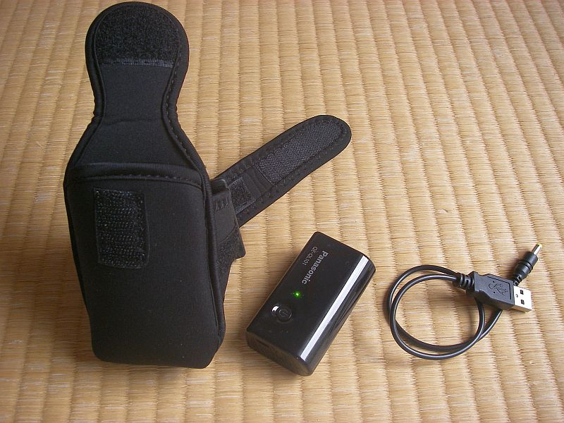 QL101の出力はセリアで購入したPSP用USB充電ケーブルを使いGZ-E100のDC端子に入力。これを、同じくセリアで見つけたアームバンド付ホルダーに入れれば、Everio専用携帯外付け電源の出来上がり。