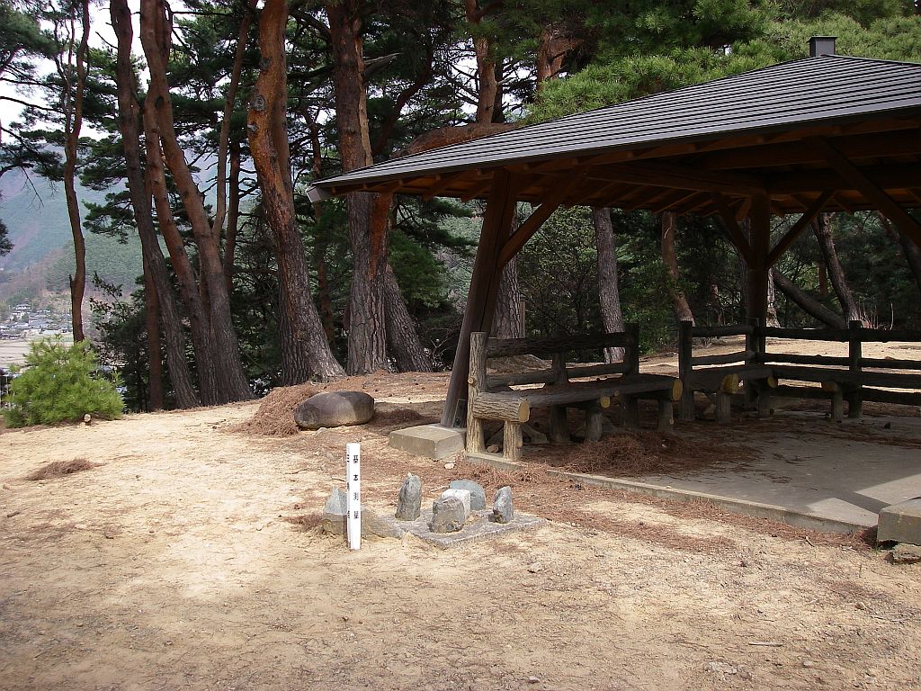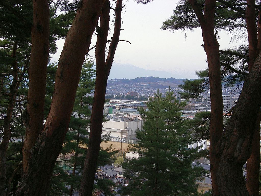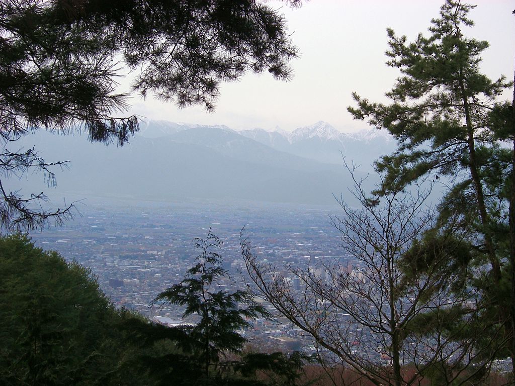 千鹿頭神社の鳥居をくぐり参道(先の宮方向)を歩くこと僅か5分。千鹿頭山頂上(657m)に到着。頂上からは赤松の間からアルプス公園や北アルプスが眺められる。