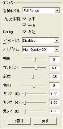 各種エフェクトの設定も可能で当初以下の設定にしていたが、変換途中強制終了される場合が多発。結局エフェクトは色合い調整以外の設定を全てなしにすることで安定変換できる様になった。