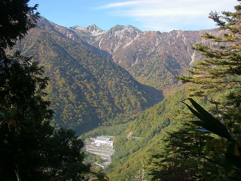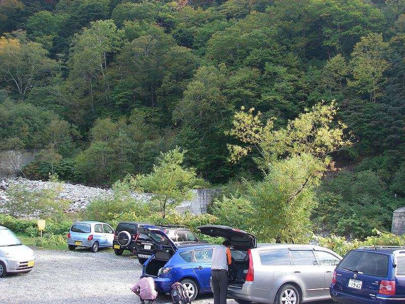 駐車場&登山口は黒部ダムの玄関口「扇沢駐車場」から1キロ程手前にある橋の横。