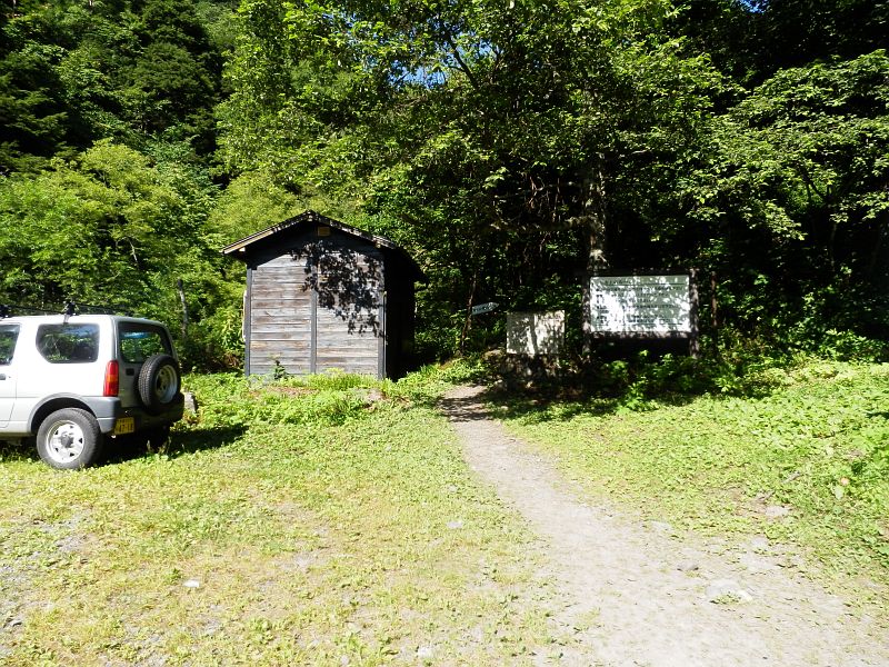 林道を歩くこと10分で三股登山口に到着。燕山登山以来の登山届けを提出し登山開始。