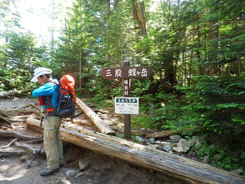 駐車場(9:10)→三股登山口(9:20)→吊橋(9:30)→力水(9:40)<最後の水場>→まめうち平(10:30)<三股2.5km←→蝶ヶ岳3.9km>→休憩(11:25-11:30)→大滝山・蝶ヶ岳分岐点(12:20)→蝶ヶ岳頂上(12:30)
