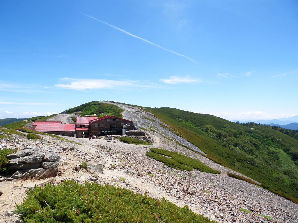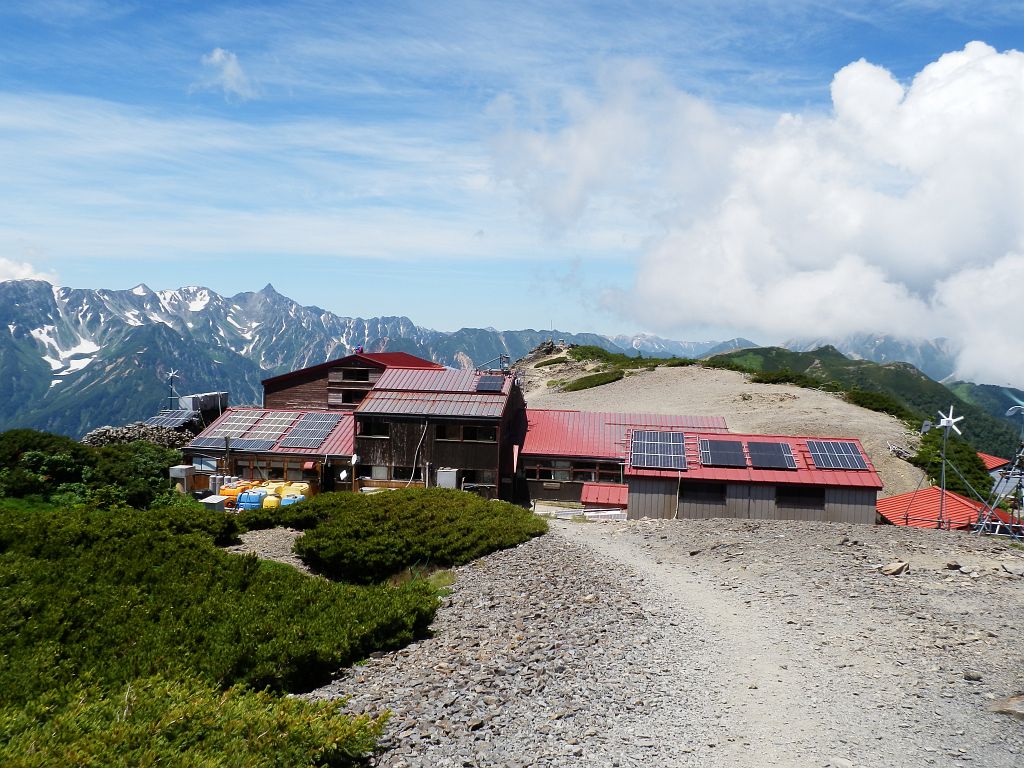 肩の小屋到着。小屋の上に見えるのは東京大学宇宙線研究所 乗鞍観測所。