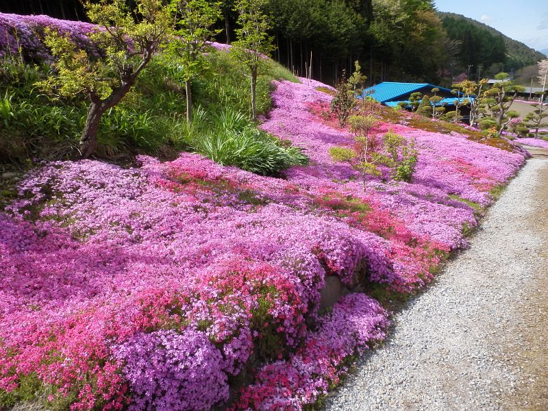 塩尻市洗馬上小曽部の大井さん宅の庭と畑のあぜ道に敷き詰められた芝桜。