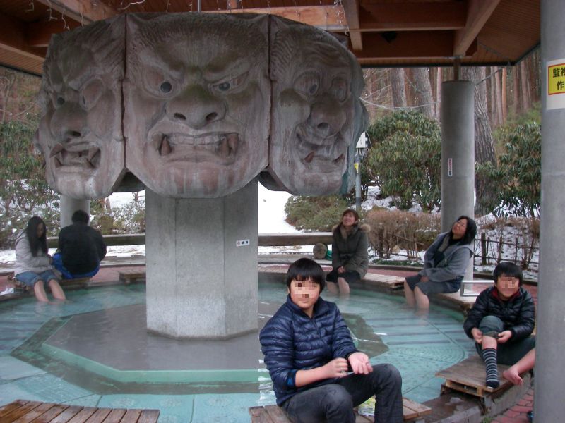 目一杯雪遊びをして疲れたんで、帰りに八面大王の足湯でちょっと一息。