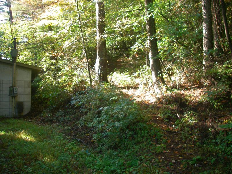 ここから右側にある立入禁止の鎖を乗り越え、林道を100m程登っていった左側にある温泉引湯施設の右脇が登り口になる。